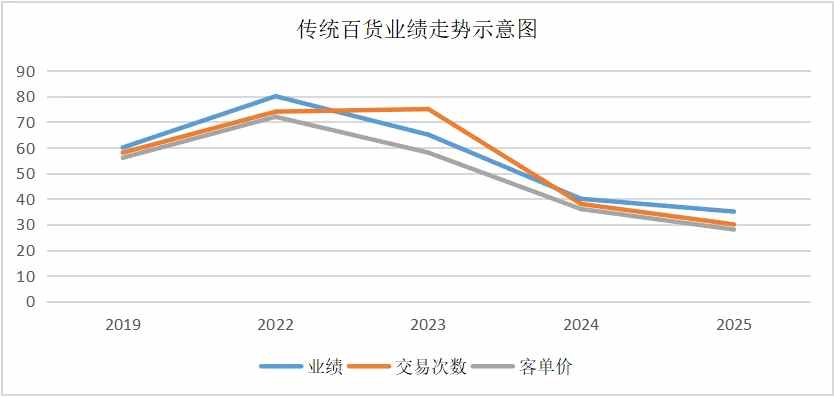從2019年到2025年,去掉中間兩年因?yàn)橐咔槌霈F(xiàn)的異常數(shù)據(jù),春節(jié)期間傳統(tǒng)百貨店的銷售業(yè)績在2022年達(dá)到相對高值,高于2019年,之后呈現(xiàn)連續(xù)下降特點(diǎn)。而2022年的高值,可以視為疫情特殊時(shí)期的消費(fèi)表現(xiàn)。